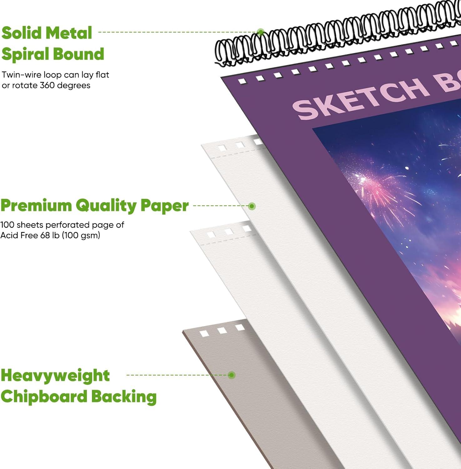 3. User-Friendly Spiral-Bound Design — The top spiral binding ensures easy page-turning for both left- and right-handed users, while the lay-flat design provides a comfortable drawing experience. The sturdy hardcover backing offers extra durability, making it portable for travel, classrooms, or outdoor sketching.